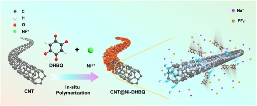 在中科院一区TOP期刊 Energy & Environmental Materials 上,团队发表题为“Synergistic π-π and π-d Interactions Between Carbon Nanotubes and Coordination Polymers Crafting Core-Shell Nanostructured Cathode for High-Performance Sodium-Organic Batteries”的论文。研究通过原位聚合法制备碳纳米管@聚合物核–壳异质结复合材料,改善聚合物电极导电性不足与活性位点利用率低的问题,构筑高效离子传输复合电极,为高性能钠离子电池应用提供理论与技术支撑。
