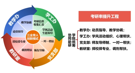 化学与化工学院坚持推行学业导师制,全院推行“考研率提升工程”,在考研录取率名列学校前茅,考研上线率为30%,其中双一流高校录取率占考研总人数的59.3%。