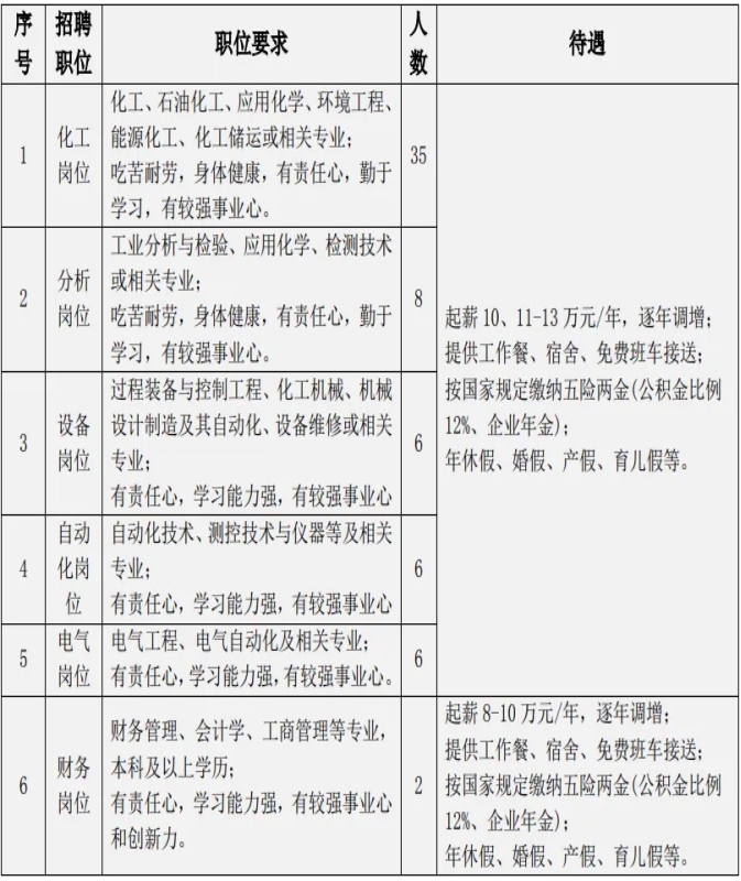 3、住房安置:公司提供设施齐全的职工宿舍,标准为 2 人/间;提供免费工作餐、免费班车接送上下班。