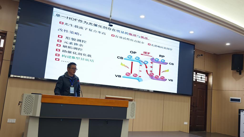 会议期间,张勇教授因在催化材料领域的突出贡献,被正式聘任为湖北省化学化工学会催化专业委员会委员,进一步彰显了其学术地位和行业影响力。在主会场特邀报告环节,张勇教授以《一种高效光催化产H2O2的HOF基S型异质结In2S3/PFC-1》为题,系统介绍了团队最新研究成果:通过构建氢键有机框架(HOF)基S型异质结光催化材料,实现高效合成H2O2的创新突破。该研究以绿色可持续为导向,在材料设计、催化机理及性能优化方面提出独到见解,其创新性思维和优异实验数据引发与会专家热烈讨论,多位学者就该技术的工业化应用前景展开深度交流。
