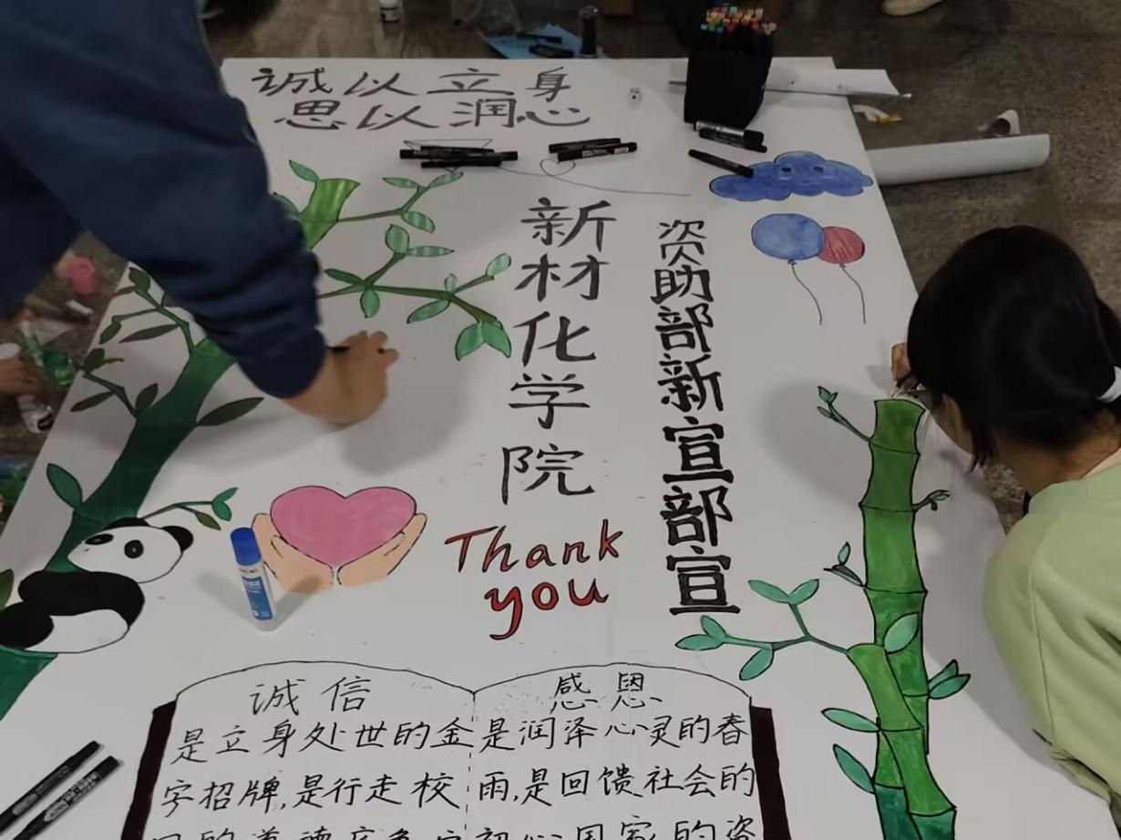 活动期间,同学们热情高涨、积极投入,以画笔为媒、以心意为墨,全身心投入到宣传展板绘制中。创作过程中,大家凝神构思、细致勾勒,一笔一画饱含专注与赤诚,一言一行彰显责任与担当;同学们分工协作、默契配合,精心排版布局,将“诚信”“感恩”的核心内涵巧妙融入色彩搭配与文字设计之中,以认真严谨的态度、饱满昂扬的热情,打造出一幅幅内容鲜明、画面精美、寓意深刻的宣传展板,充分展现了新时代青年学子积极向上、笃行向善的精神风貌。