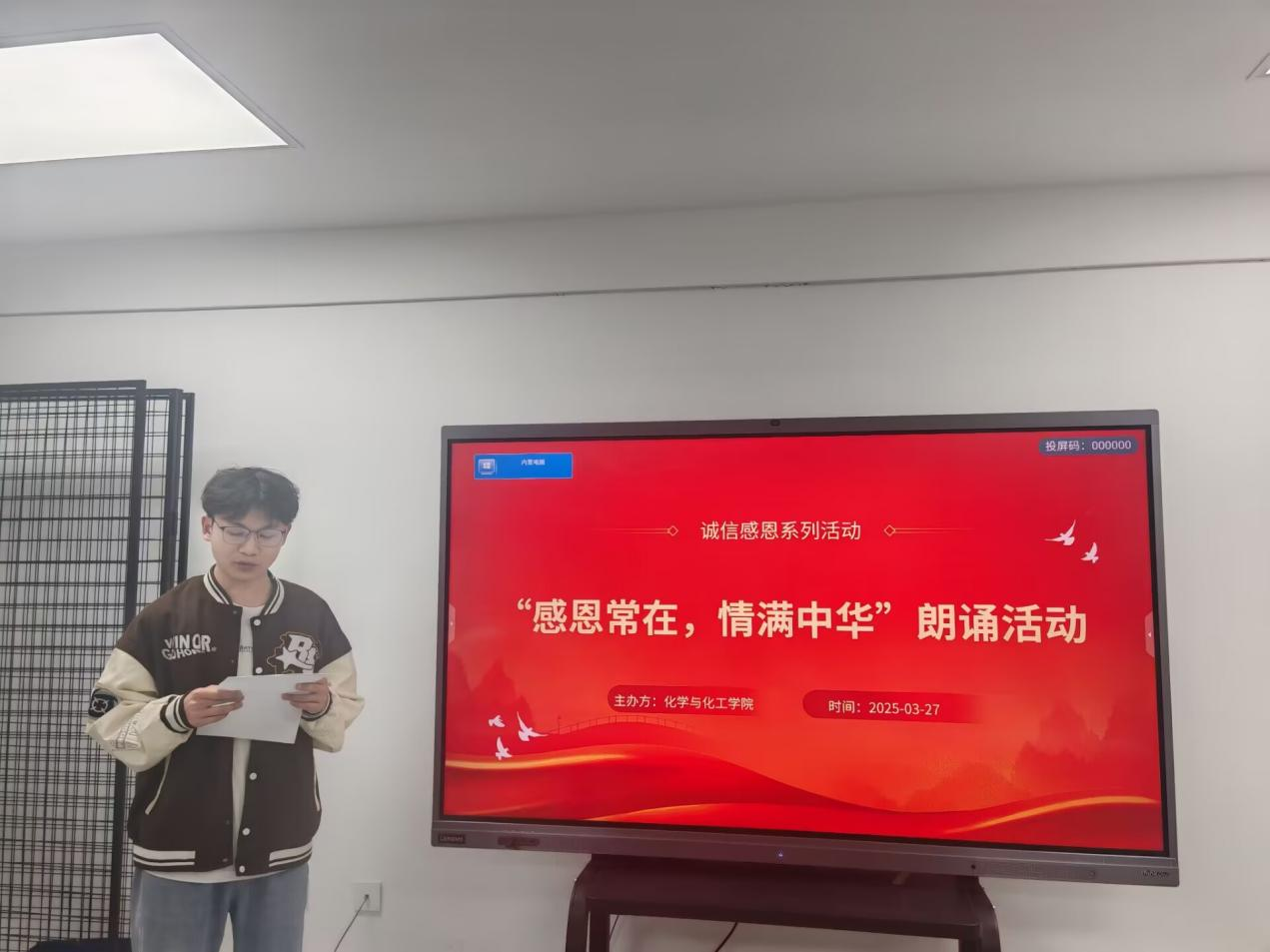 为弘扬中华民族传统美德,增强同学们的感恩意识,化学与化工学院于3月27日在求实一站式学生社区102举办“感恩常在,情满中华”朗诵比赛。比赛过程中,同学们以饱满的热情和真挚的情感,通过朗诵的形式表达了对祖国、父母、师长和生活的感恩之情。一首《感恩常在,情满中华》的朗诵将对祖国的热爱、对民族团结的赞美以及对中华文化的自豪之情展现得淋漓尽致;一首《感恩父母,点亮生命的烛光》的朗诵,表达了对感恩父母日夜辛劳养育我们的感恩之情,让听众更加深切地感受到父母的爱;一首《恩师长歌》朗诵表达了对老师的感恩之情,感谢老师们的辛勤付出和默默陪伴......