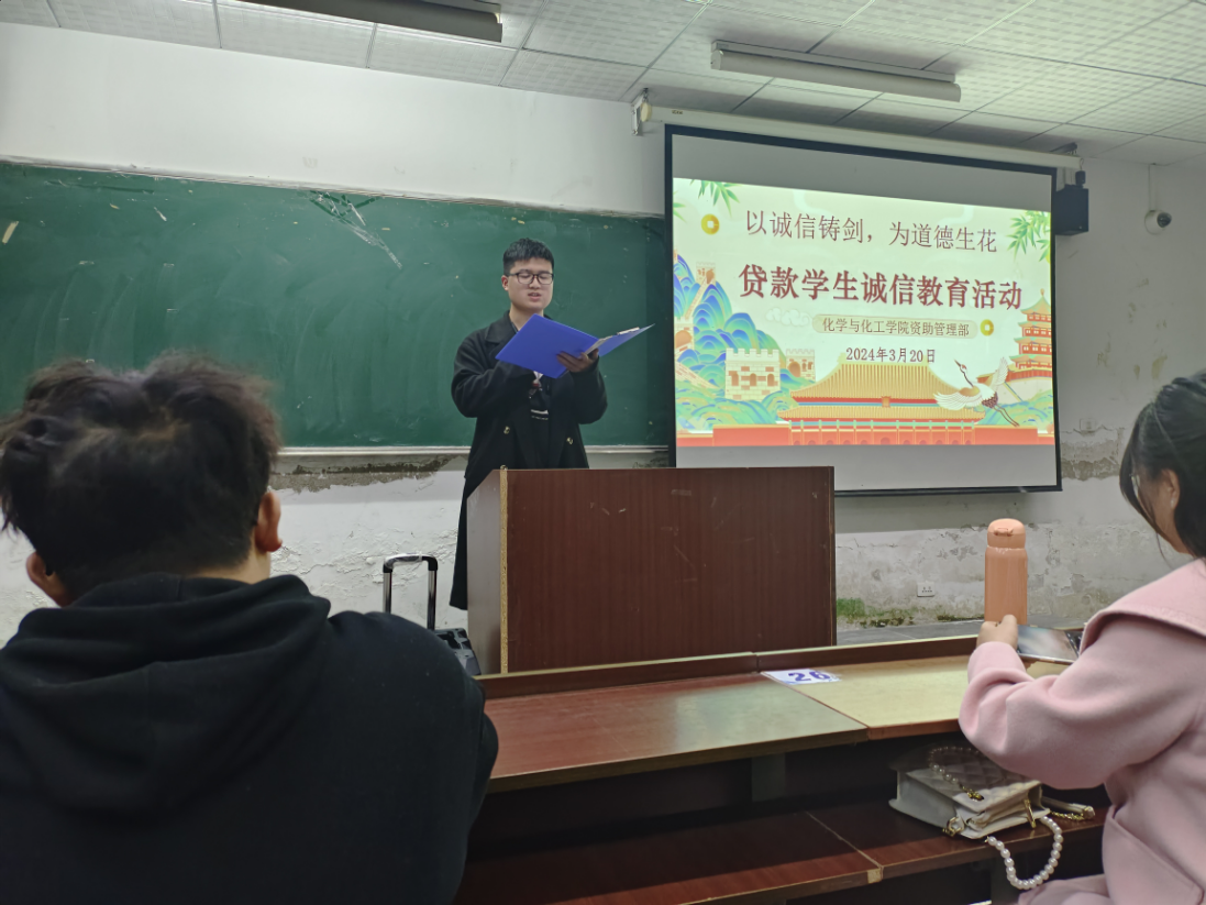 3月20晚,化学与化工学院在J3-403开展“以诚信铸剑,为道德生花”为主题的贷款学生诚信教育活动。辅导员刘霞、资助管理部部长冯清昊详细解读了国家助学贷款的办理流程,通过观看助学贷款政策影片、解读贷款政策、优秀贷款生发言和诚信签名等环节,使同学们了解了国家征信体系和生源地贷款的还贷知识、对树立大学生的诚信、按时还贷意识起到了良好的促进作用。