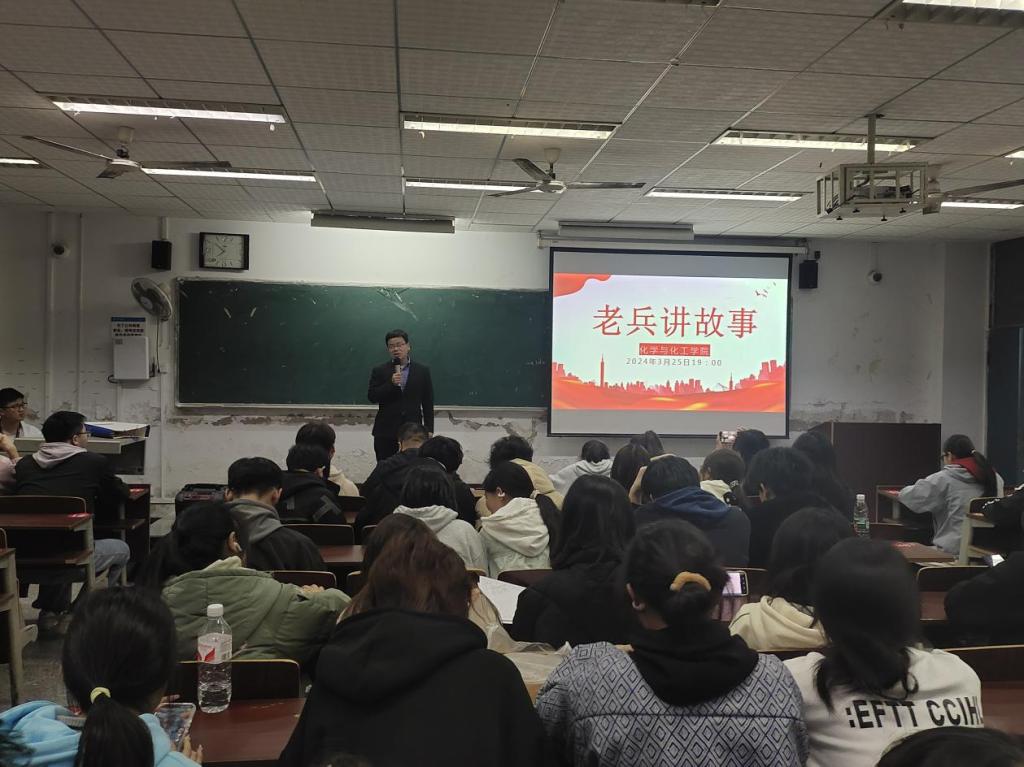 “部队像是一个大熔炉,进来一身铁,出去一身钢,只要进了部队就不怕你不成钢”。3月25日晚,化学与化工学院开展“听老兵讲故事,忆峥嵘岁月,扬爱国精神”为主题的老兵讲故事活动,此次活动我们邀请到化工学院四位退伍大学生士兵讲述军旅生活。化工学院党总支副书记闵建华、辅导员刘霞、苏家兴、学生代表参加了此次活动。