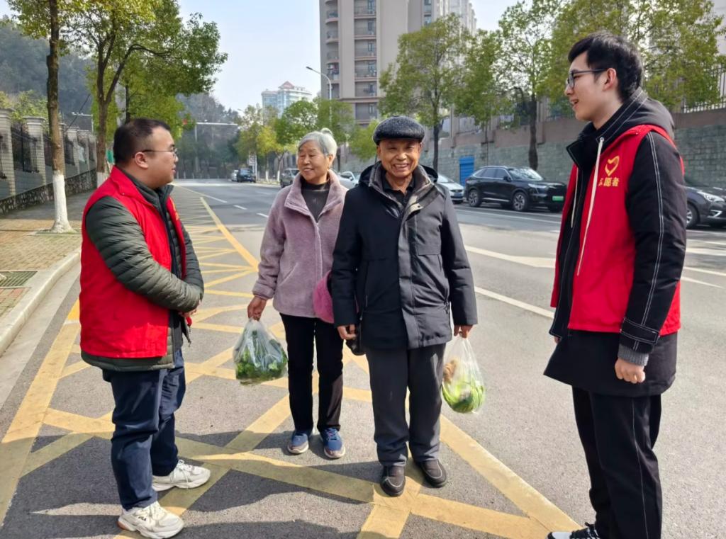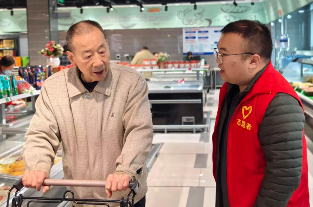 志愿者们有的在超市帮助老人寻找商品,有的帮忙老人提重物回家,有的在路边给老人进行健康知识的科普……