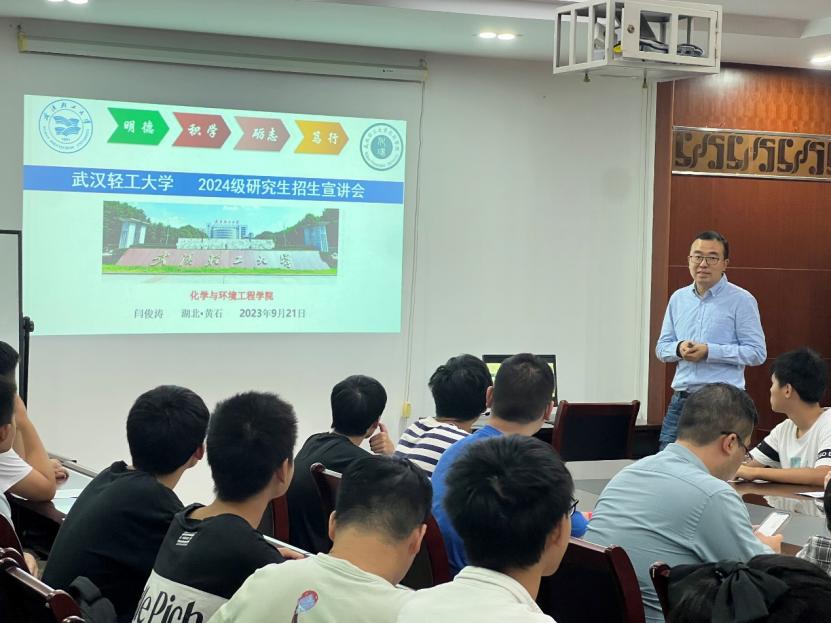 闫俊涛为大家详细介绍武汉轻工大学的研究生招生情况。他分享了学校的人文历史、办学理念、学风建设、师资力量及专业特色;他指出学校的相关学科专业及科研学术水平发展趋势较好,部分领域的学术水平在全球具有较高的影响力;武汉轻工业大学拥有一座中国唯一的高质量、高水平的油脂博物馆,多元的实践平台为学生提供良好的师资培训指导和优质的创新研发资源;他强调武汉轻工大学化学与环境工程学院的科研项目、导师团队、获奖情况及就业前景较好,鼓励我院学子积极报考。