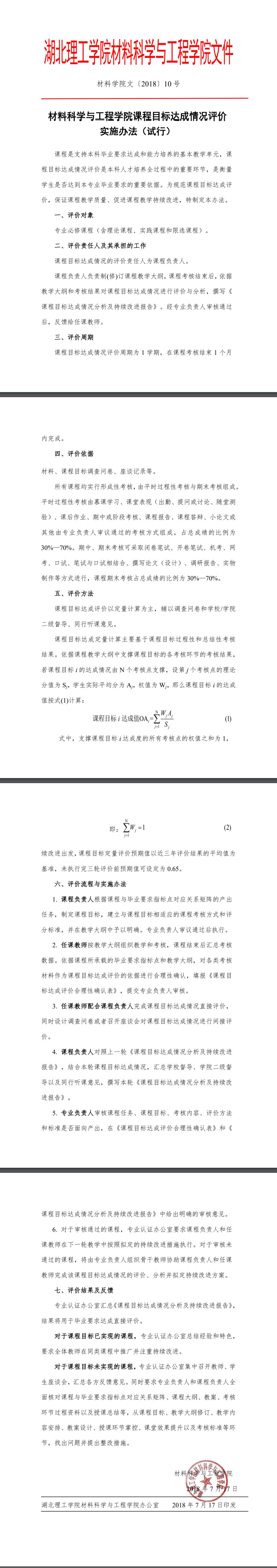 《材料科学与工程学院课程目标达成情况评价实施办法(试行)》