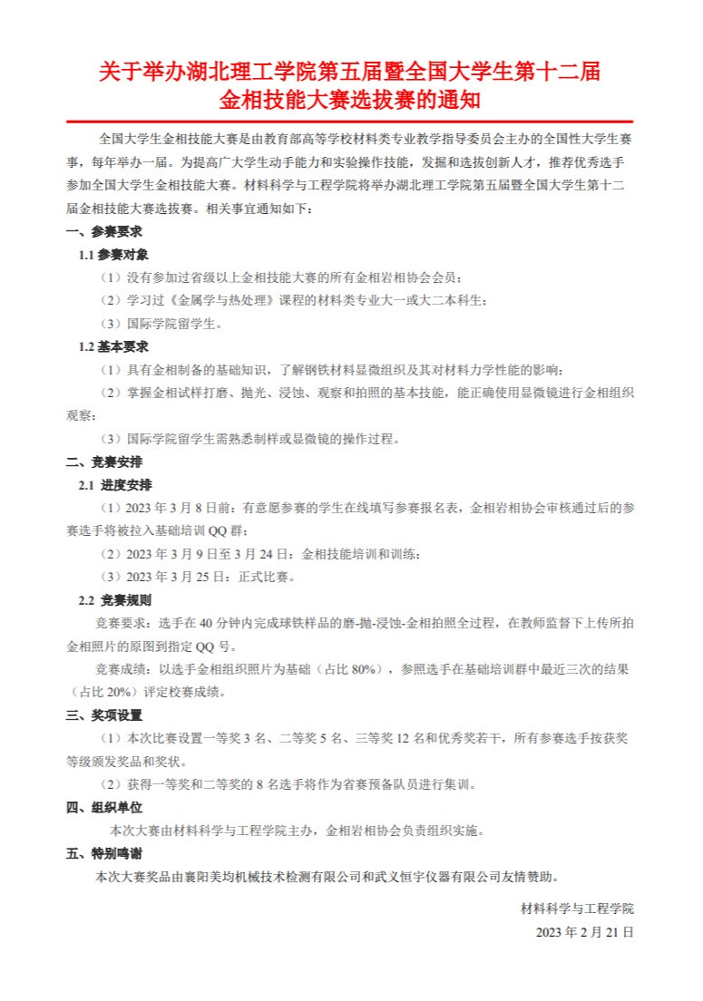 关于举办太阳网集团tcy8722第五届暨全国大学生第十二届金相技能大赛选拔赛的通知